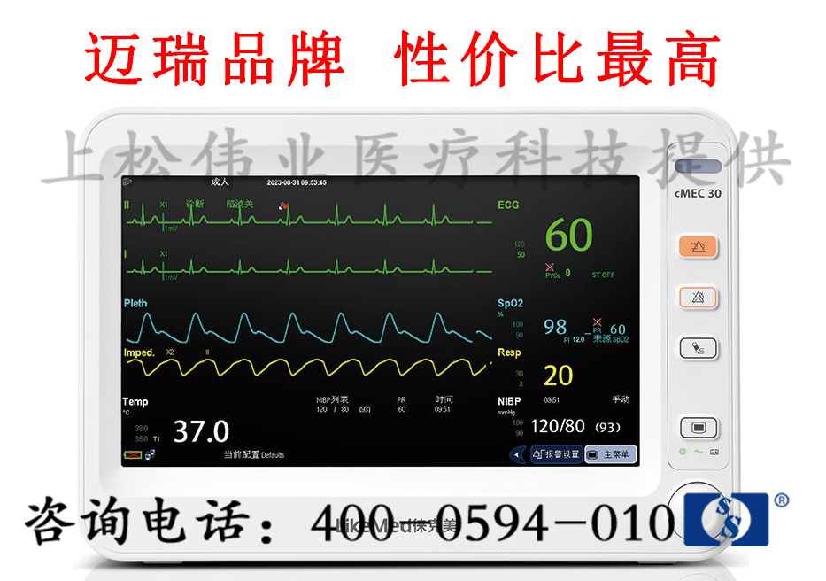 标配参数:3/5导ECG, Resp, SpO2,NIBP, PR,1通道TEMP