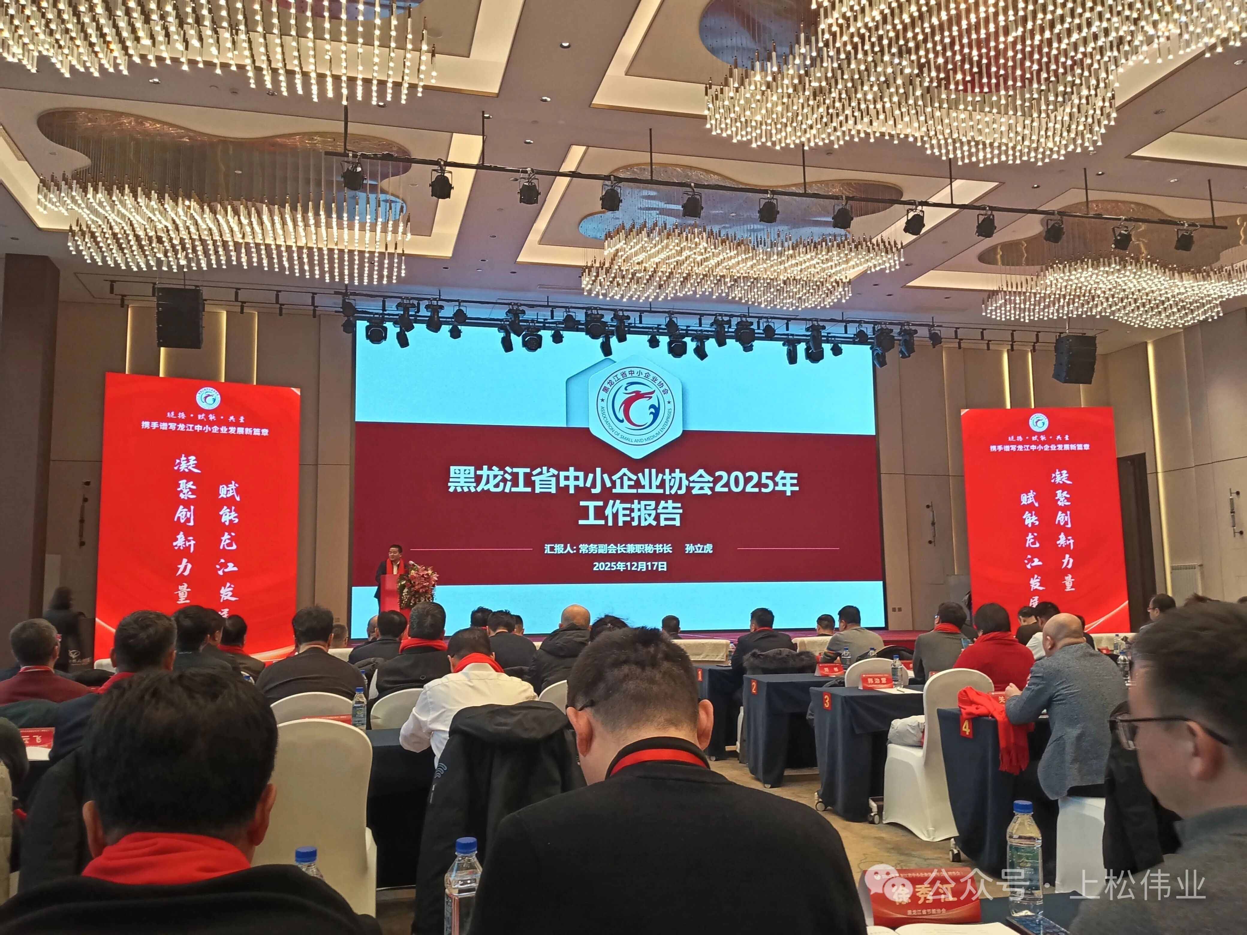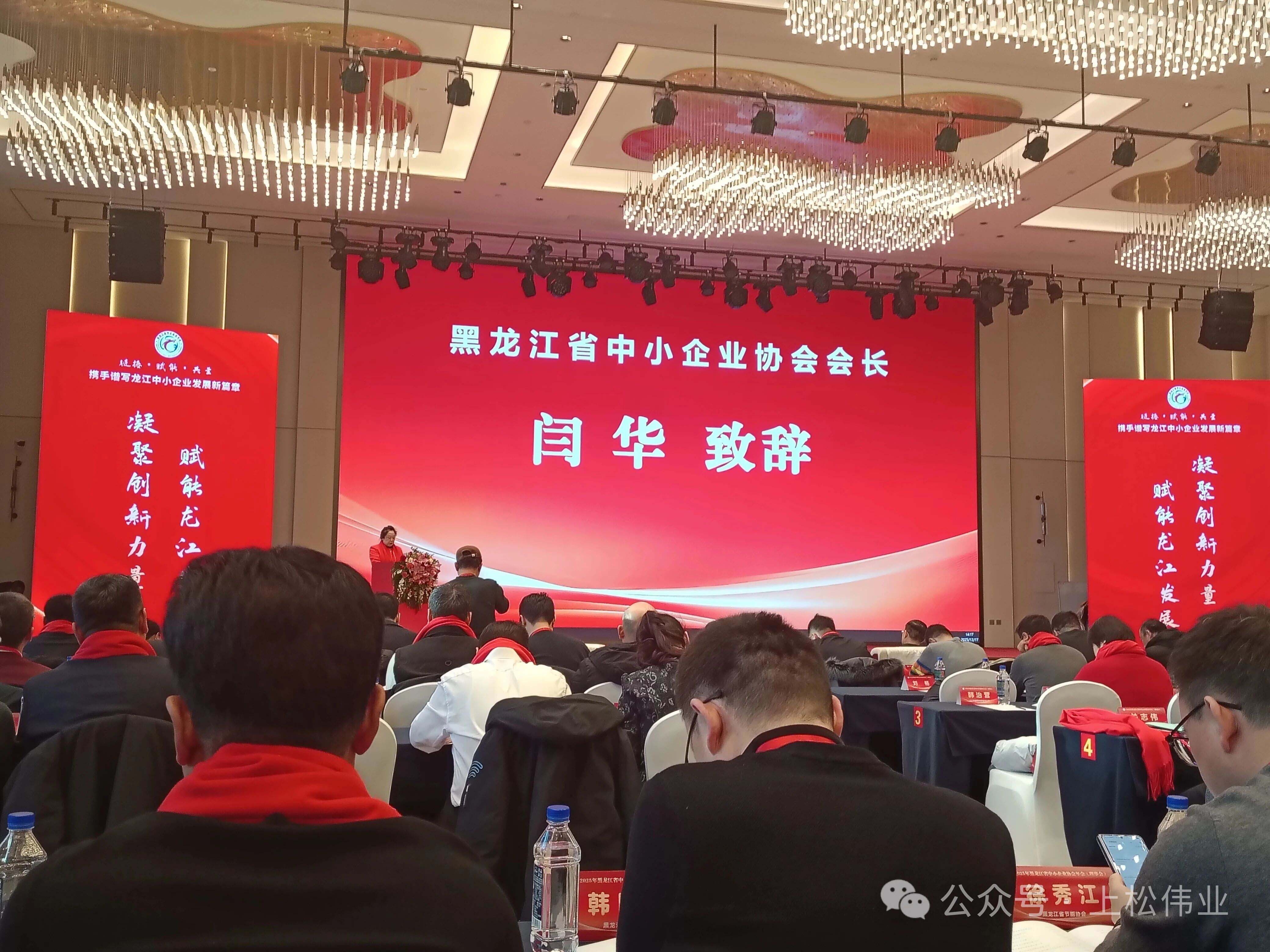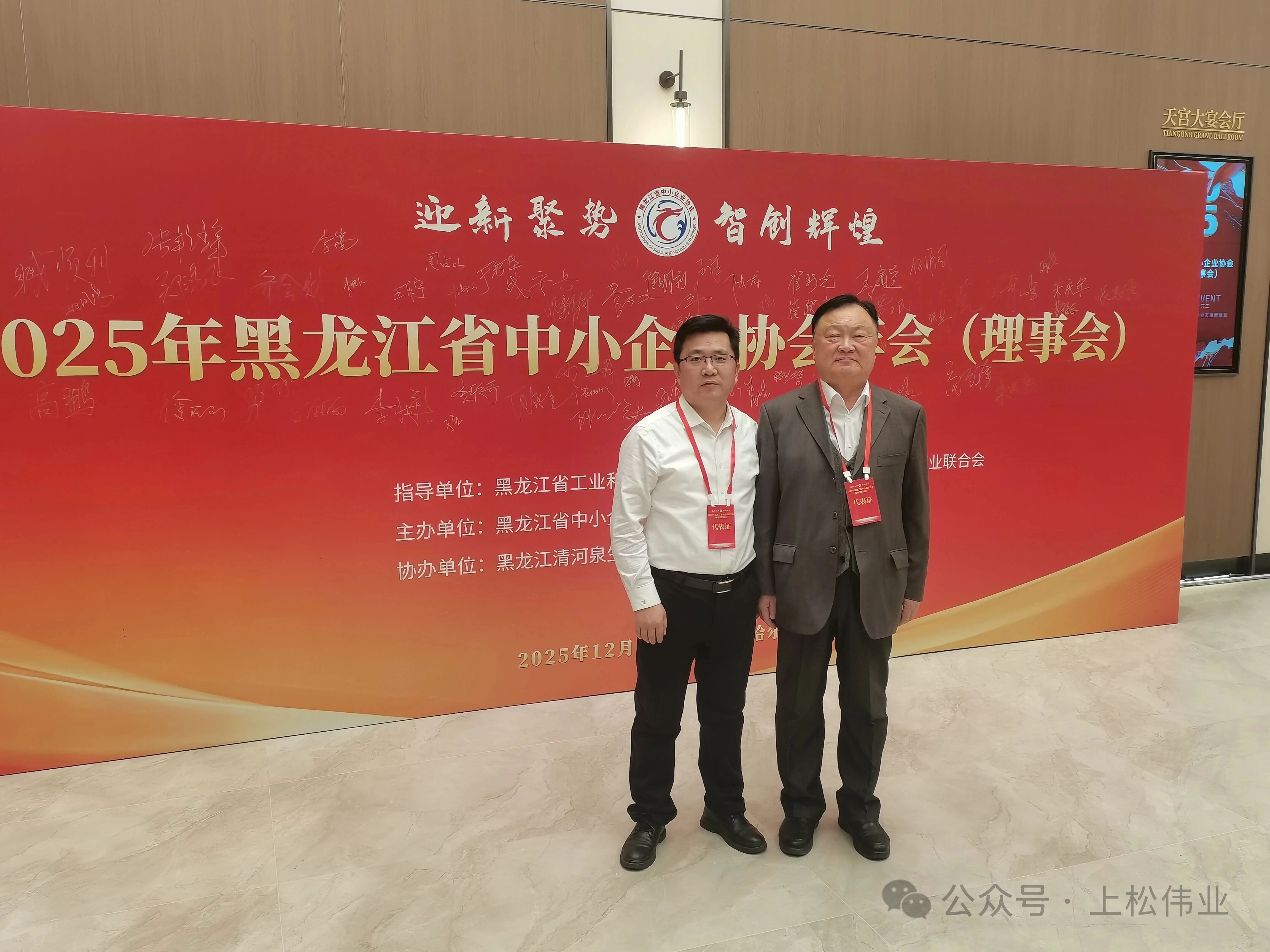 2025年12月17日,黑龙江省中小企业协会2025年年会(理事会)在哈尔滨冠洋世纪大酒店盛大启幕。 本次大会以“迎新聚势 智创辉煌”为核心主题,汇聚省直相关部门领导、行业顶尖专家、标杆企业家及优质服务机构代表,搭建起政策解读、经验交流、资源对接的高端平台。我公司总经理陈国松、办公室主任金慧婷受邀参会,与各界精英共话发展,为龙江中小企业高质量发展注入强劲动力,助力全省民营经济在振兴征程上阔步前行。
