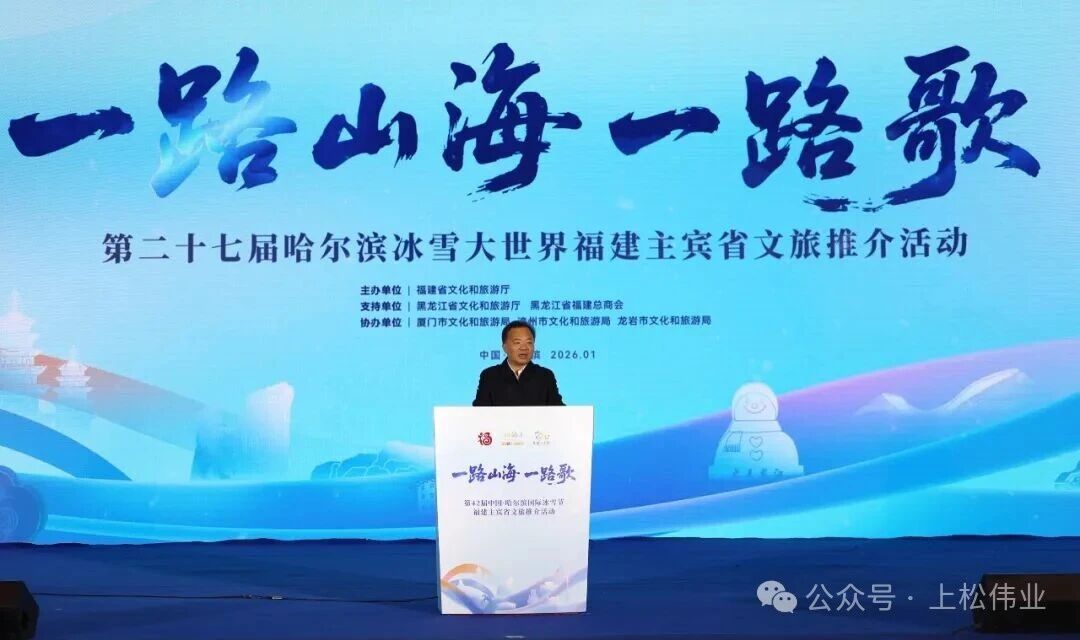 活动现场播放了文旅宣传片《冰雪福缘》,发布“龙游福气”旅游产品包,启动“交换冬天·乐享福年”文旅惠民计划,双方文旅企业举行集中签约。“浪花慕雪白,乐享福年来”福建文旅图片展、“福气临门,闽韵流芳”福建非遗展演等活动也同步开启。福建省文旅厅厅长张源生、黑龙江省文旅厅厅长何晶,哈尔滨市委常委、宣传部部长兰峰,哈尔滨市政府副市长王波等两省市相关领导,以及哈尔滨市、厦门市、漳州市、龙岩市文旅部门负责同志参加。黑龙江省福建总商会会长吴庆和、秘书长汤丹妮、上松伟业医疗科技(哈尔滨)有限公司总经理陈国松、上京伟业科技发展(北京)有限公司办公室主任金慧亭以及其他部分企业代表参会,共同见证这场南北文旅融合的盛会。